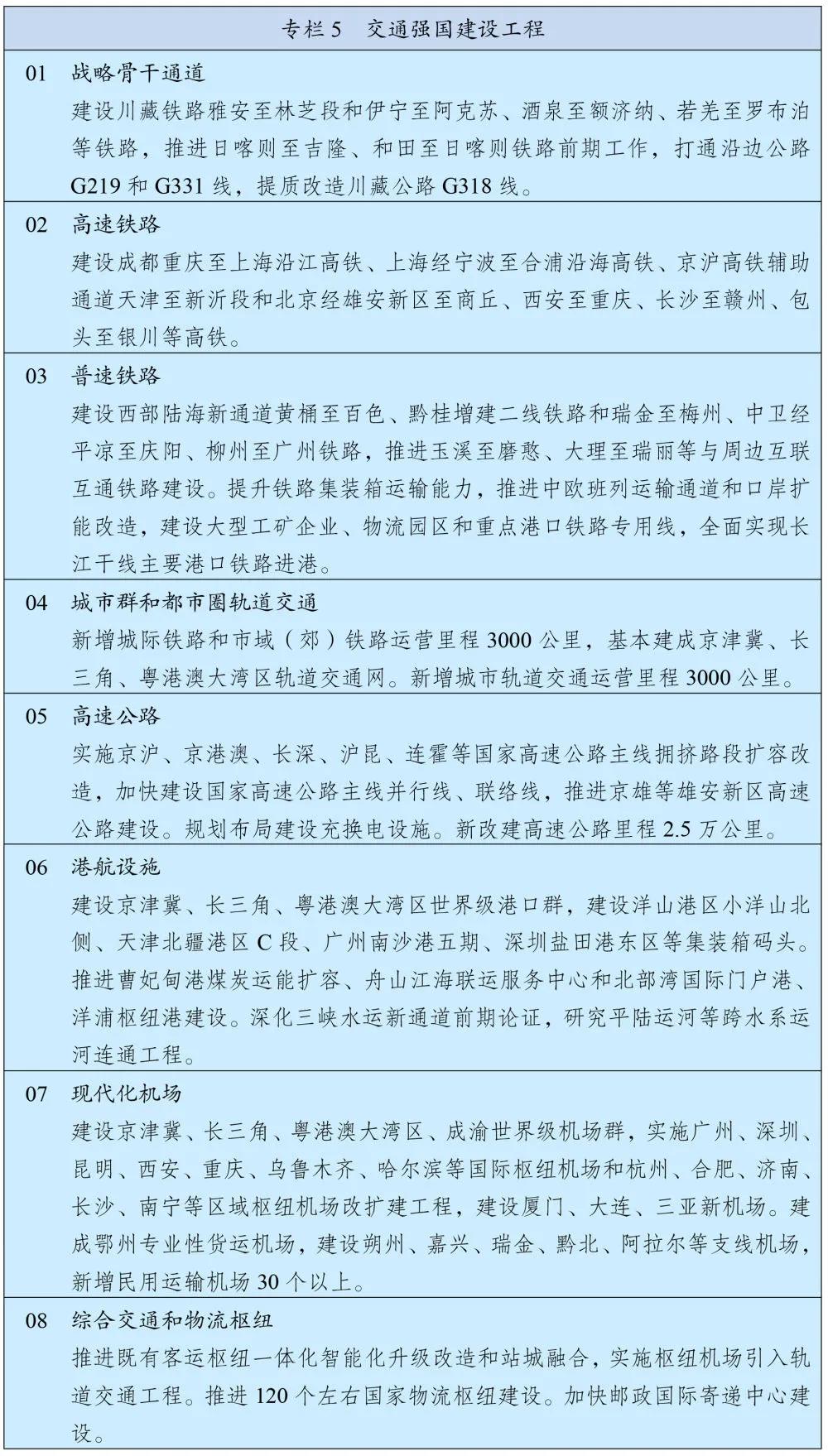 前瞻布局6G網(wǎng)絡(luò)技術(shù)儲備。 擴容骨干網(wǎng)互聯(lián)節(jié)點,新設(shè)一批國際通信出入口,全面推進互聯(lián)網(wǎng)協(xié)議第六版(IPv6)商用部署。 實施中西部地區(qū)中小城市基礎(chǔ)網(wǎng)絡(luò)完善工程。 推動物聯(lián)網(wǎng)全面發(fā)展,打造支持固移融合、寬窄結(jié)合的物聯(lián)接入能力。 建設(shè)若干國家樞紐節(jié)點和大數(shù)據(jù)中心集群,建設(shè)E級和10E級超級計算中心。 積極穩(wěn)妥發(fā)展工業(yè)互聯(lián)網(wǎng)和車聯(lián)網(wǎng)。 打造全球覆蓋、高效運行的通信、導航、遙感空間基礎(chǔ)設(shè)施體系,建設(shè)商業(yè)航天發(fā)射場。 加快交通、能源、市政等傳統(tǒng)基礎(chǔ)設(shè)施數(shù)字化改造,加強泛在感知、終端聯(lián)網(wǎng)、智能調(diào)度體系建設(shè)。 打通多元化投資渠道,構(gòu)建新型基礎(chǔ)設(shè)施標準體系。 交通強國建設(shè)工程 加強出疆入藏、中西部地區(qū)、沿江沿海沿邊戰(zhàn)略骨干通道建設(shè),加強與周邊國家互聯(lián)互通。 構(gòu)建快速網(wǎng),基本貫通“八縱八橫”高速鐵路,提升國家高速公路網(wǎng)絡(luò)質(zhì)量,加快建設(shè)世界級港口群和機場群。