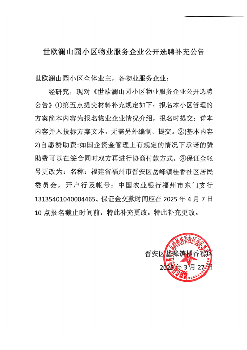 世歐瀾山園小區(qū)物業(yè)服務企業(yè)公開選聘補充公告