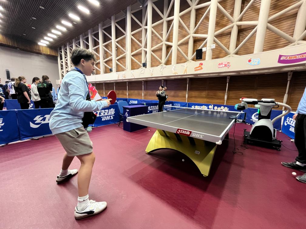 4月12日,美國(guó)青少年在上海國(guó)際乒聯(lián)博物館和中國(guó)乒乓球博物館的乒乓球發(fā)球機(jī)器人前體驗(yàn)接球。新華社記者有之炘攝 二樓體驗(yàn)區(qū)的乒乓球發(fā)球機(jī)器人前,學(xué)生們輪番挑戰(zhàn)。曾在美國(guó)全國(guó)U14乒乓球比賽中拿下過(guò)第7名的瑞恩·特洛伊·李揮拍上陣,飛快的反應(yīng)速度引發(fā)伙伴們此起彼伏的歡呼和掌聲。 普爾斯維爾高中的伊恩·斯科特·哈珀捧著體驗(yàn)紀(jì)念證書與同伴興奮合影:“相比匹克球,乒乓球節(jié)奏更快,對(duì)反應(yīng)速度和擊球精度要求更高。我喜歡這里的氛圍,處處彰顯著體育的魅力!”