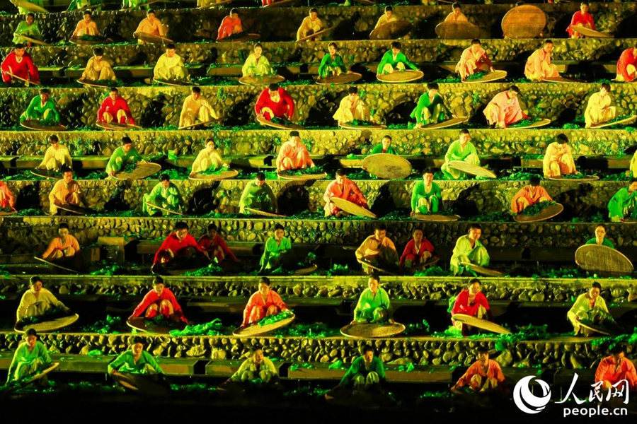 《印象大紅袍》演出將傳統(tǒng)技藝與現(xiàn)代舞美技術(shù)相融合,融入武夷茶農(nóng)搖青的場景。人民網(wǎng) 李唯一攝