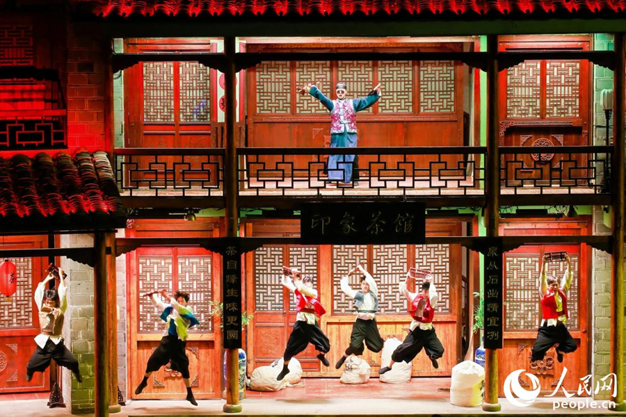 王龍濤(上)飾演茶掌柜帶領茶廠的伙計,為五湖四海的茶商計算“武夷四大名樅”的價格。人民網(wǎng) 李唯一攝