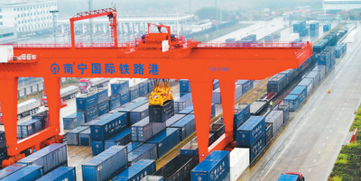 廣西南寧國際鐵路港是中國鐵路出口越南集散中心,也是中國西部陸海新通道的重要節(jié)點。圖為南寧國際鐵路港一片繁忙景象。