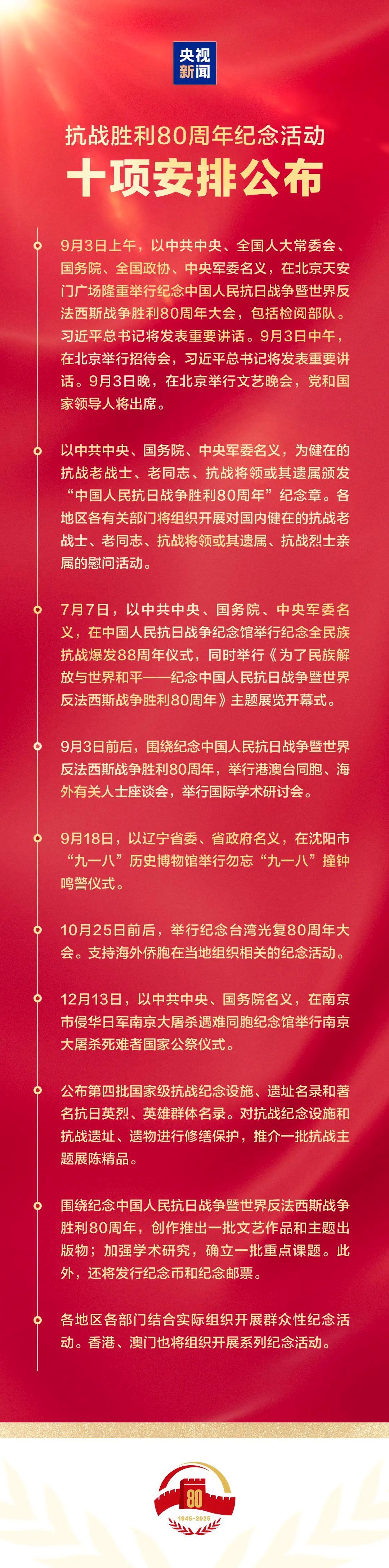 今天上午,國新辦舉行新聞發(fā)布會,介紹了紀(jì)念活動總體安排。主要的活動安排,共有十項。習(xí)近平總書記將出席紀(jì)念中國人民抗日戰(zhàn)爭暨世界反法西斯戰(zhàn)爭勝利80周年大會并發(fā)表重要講話。