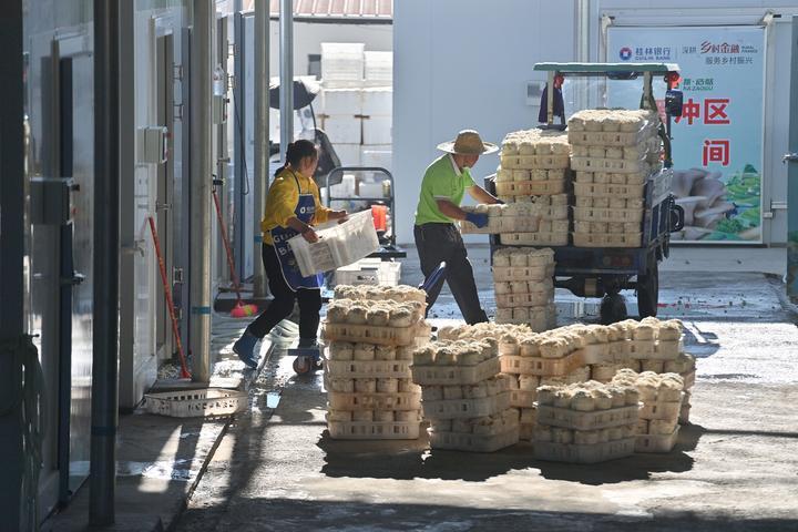 2024年10月31日,村民在廣西百色市德保縣那造村食用菌生產(chǎn)基地搬運采摘的蘑菇。那造村通過做優(yōu)特色產(chǎn)業(yè)、豐富村民生活、完善基礎設施等多項具體舉措,推動各項事業(yè)快速發(fā)展。