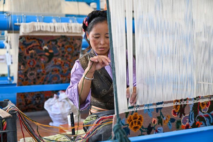 2025年7月18日,江孜藏毯文化發(fā)展有限責任公司的員工在生產(chǎn)車間內(nèi)編織藏毯。西藏日喀則市江孜縣是著名的藏毯(藏族稱為“卡墊”)之鄉(xiāng),織毯歷史悠久。藏族卡墊織造技藝于2006年被列入國家級非物質(zhì)文化遺產(chǎn)代表性項目名錄。近年來,江孜藏毯在守護傳統(tǒng)技藝的同時積極創(chuàng)新,通過建立合作社、開辦技能培訓班等方式擴大靈活就業(yè)規(guī)模,讓更多人在家門口織藏毯增收。