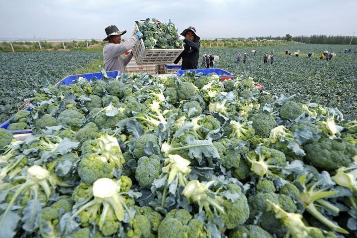 2025年7月18日,工作人員在寧夏固原市原州區(qū)彭堡鎮(zhèn)萬畝冷涼蔬菜基地運輸西蘭花。固原依托高海拔、氣候冷涼等“冷資源”優(yōu)勢,大力發(fā)展冷涼蔬菜產(chǎn)業(yè),著力打造“六盤山冷涼蔬菜”區(qū)域公用品牌。目前已建成冷涼蔬菜規(guī)模化種植基地130余個,種植面積穩(wěn)定在50萬畝,年產(chǎn)鮮菜200萬噸以上?!傲P山冷涼蔬菜”這張打造的“綠色名片”,已成為當?shù)剜l(xiāng)村振興發(fā)展之路上的“熱產(chǎn)業(yè)”。