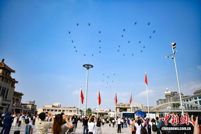 直升機(jī)組成巨大的“80”字樣。中新社記者 楊華峰 攝