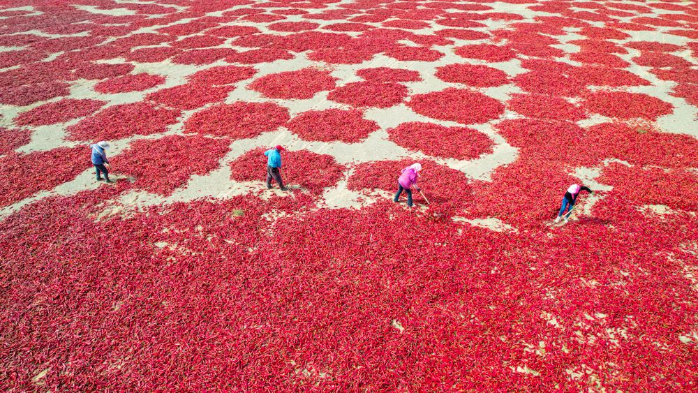 ↑2025年9月20日,農民在甘肅省酒泉市肅州區(qū)三墩鎮(zhèn)晾曬紅辣椒。(無人機照片)CICPHOTO/曹紅祖 攝