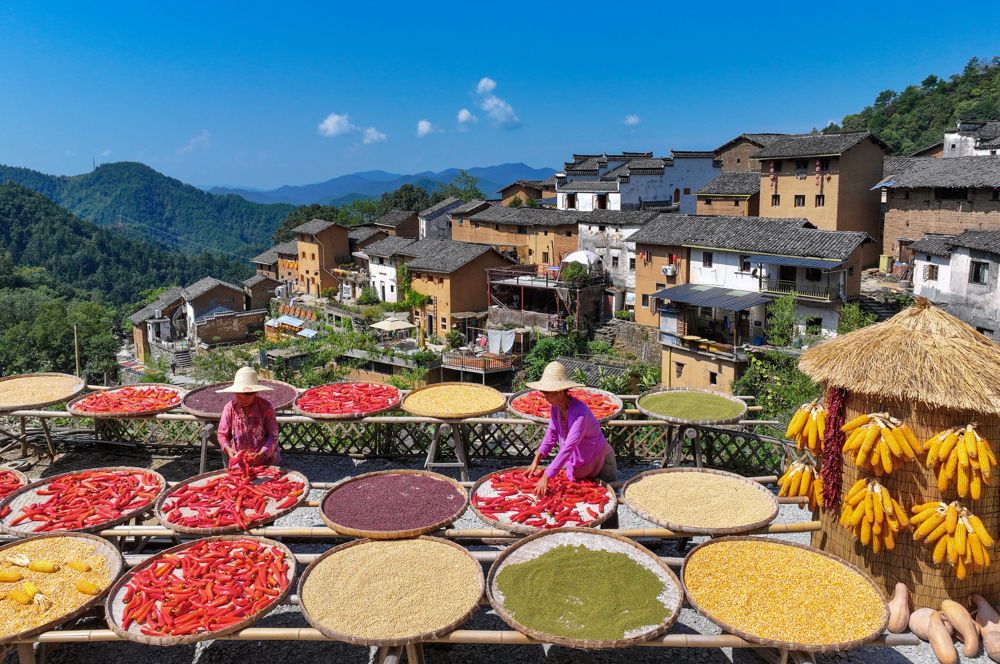 ↑2025年9月17日,農民在安徽省黃山市歙縣深渡鎮(zhèn)陽產村晾曬稻谷、玉米、南瓜、紅辣椒等農作物。CICPHOTO/施亞磊 攝