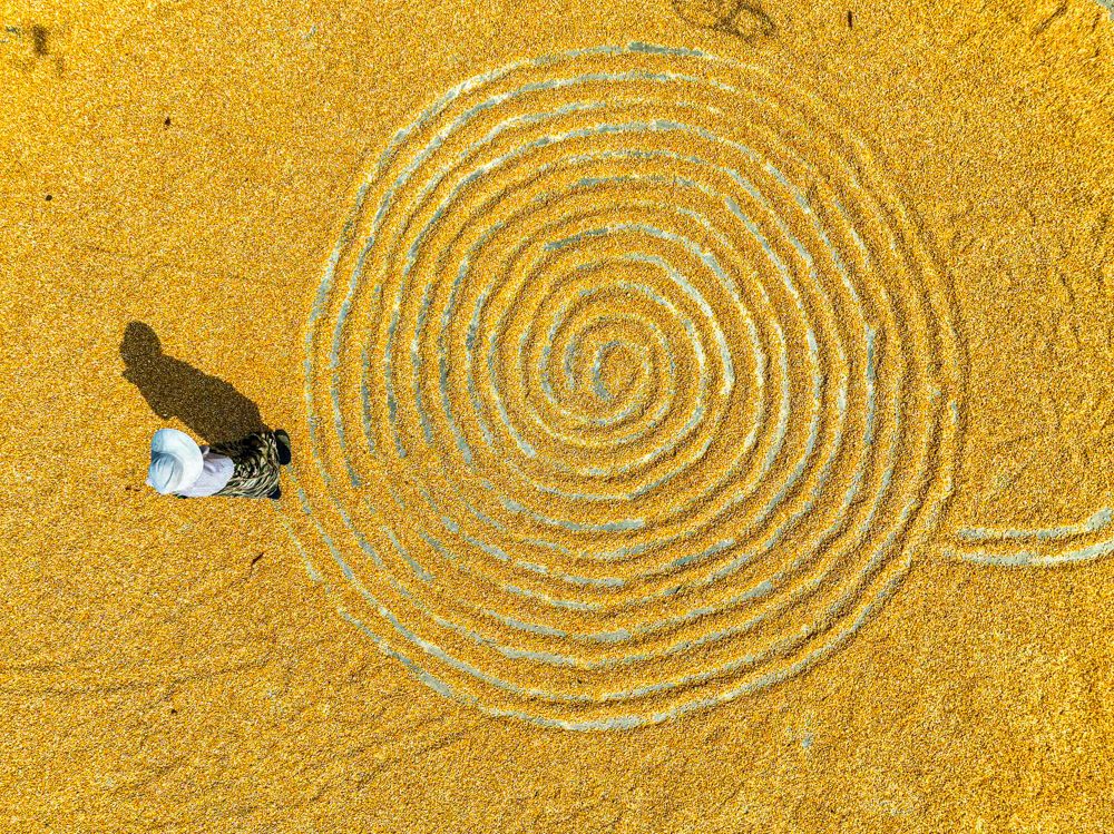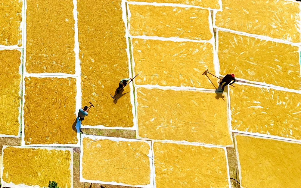 ↑2025年9月13日,農民在貴州省黔東南苗族侗族自治州從江縣東朗鎮(zhèn)擺啊村翻曬稻谷。(無人機照片)CICPHOTO/樊紹光 攝