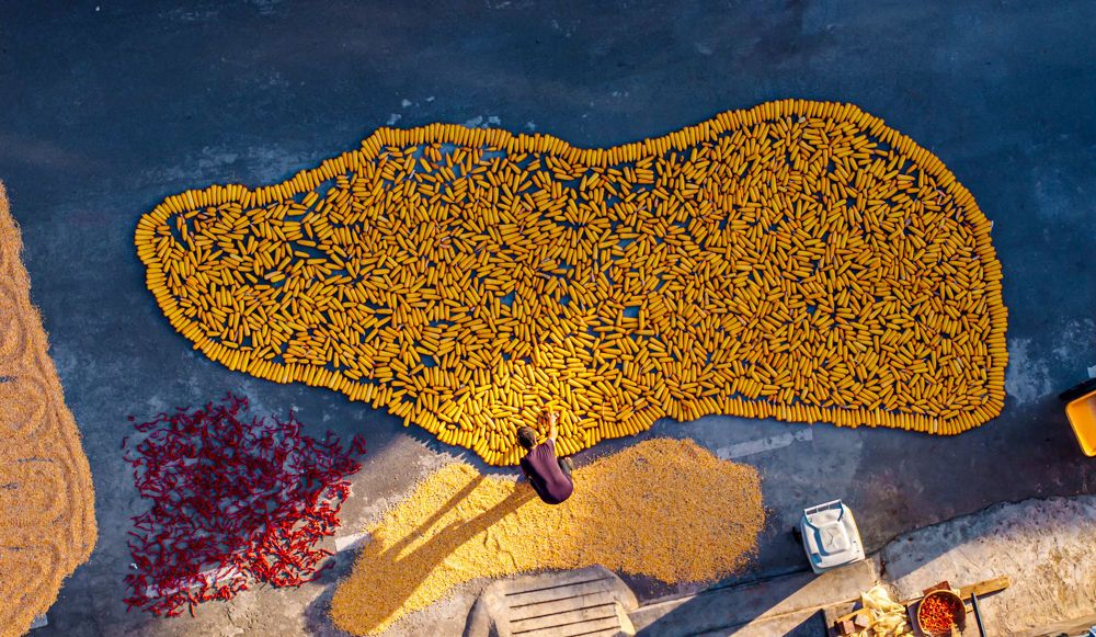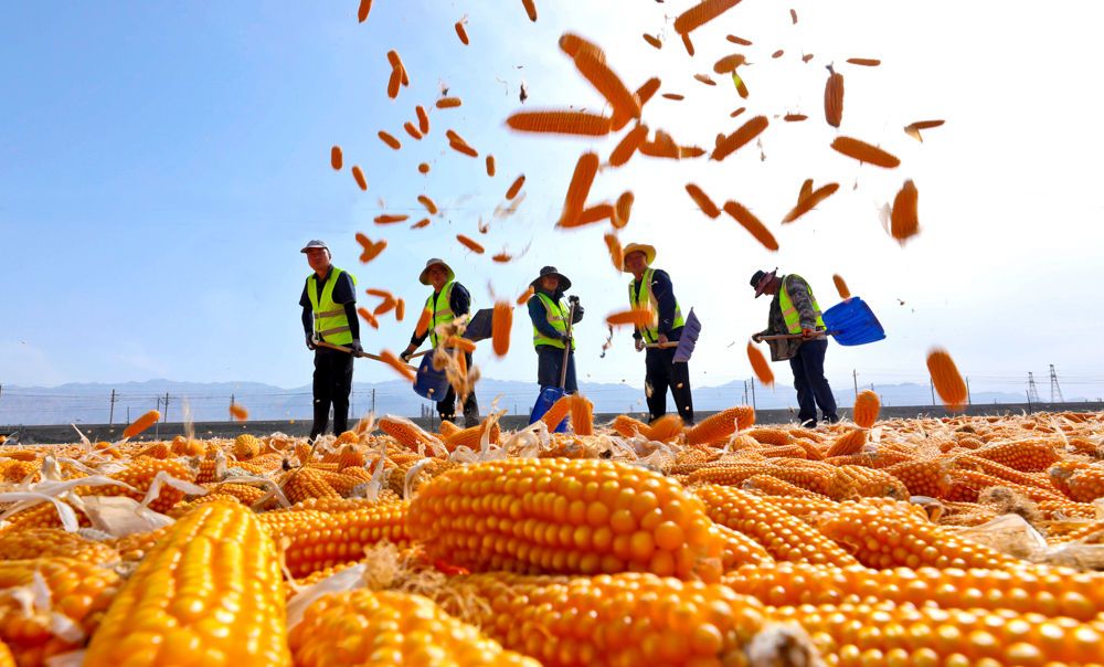 ↑2025年9月11日,工人在甘肅省張掖市高臺縣南華工業(yè)園區(qū)翻曬制種玉米。(無人機照片)CICPHOTO/王將 攝