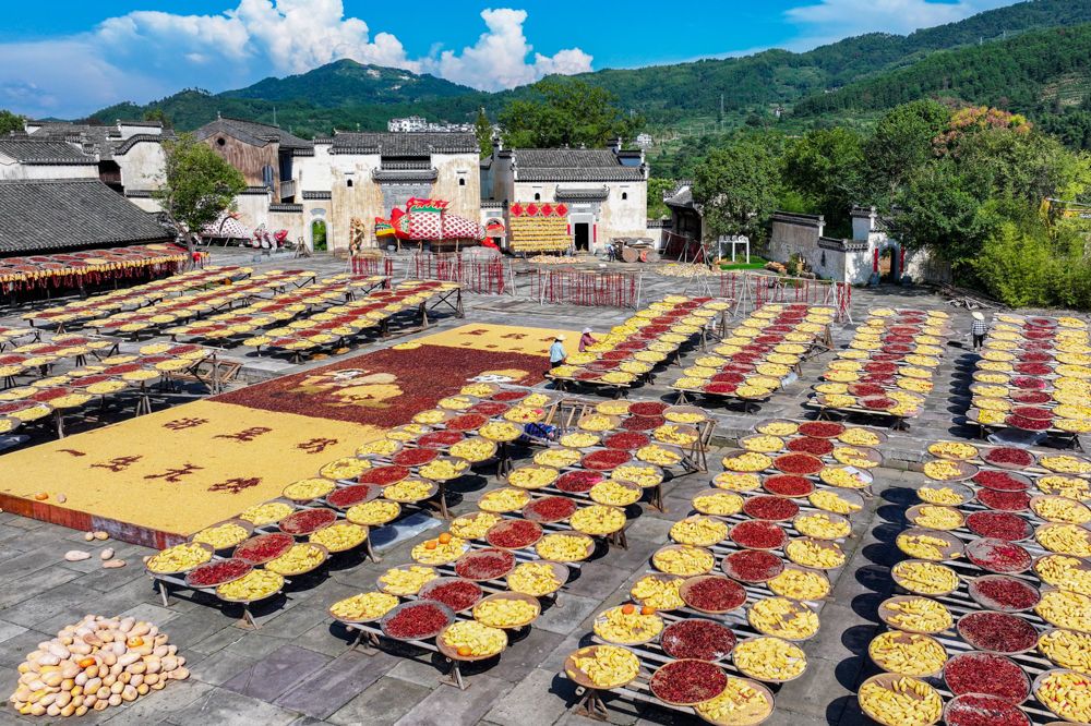 ↑2025年9月15日,農民在安徽省黃山市徽州區(qū)呈坎村晾曬稻谷、玉米、南瓜、紅辣椒、筍干等農作物。(無人機照片)CICPHOTO/潘禎祥 攝
