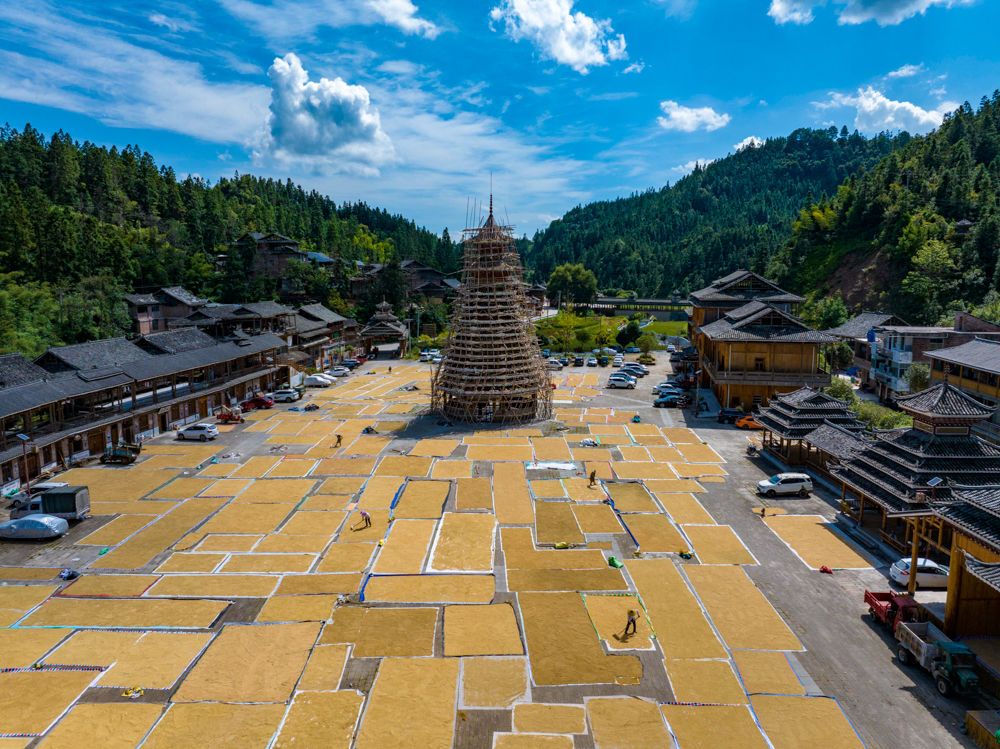 ↑2025年9月15日,農民在貴州省從江縣高增鄉(xiāng)小黃侗寨晾曬稻谷。(無人機照片)CICPHOTO/吳德軍 攝