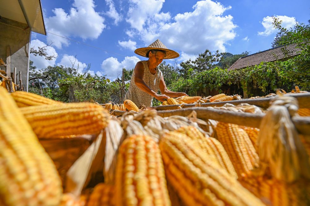 ↑2025年9月13日,農民在山東省青州市廟子鎮(zhèn)局子峪村晾曬玉米。CICPHOTO/王繼林 攝