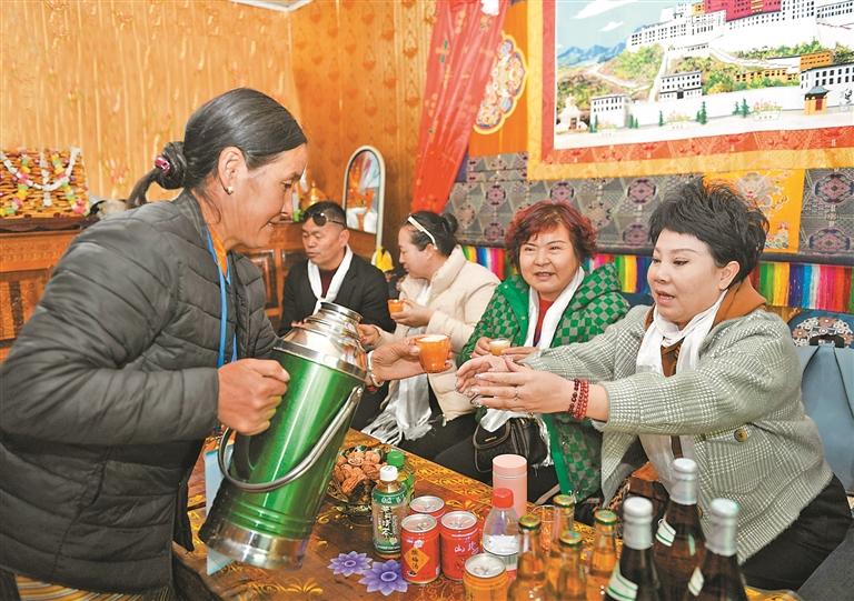 山南市乃東區(qū)扎西曲登社區(qū)的112號民宿主人剛組為游客們倒上熱乎的酥油茶。記者 旦增蘭澤 洛桑 唐斌 攝
