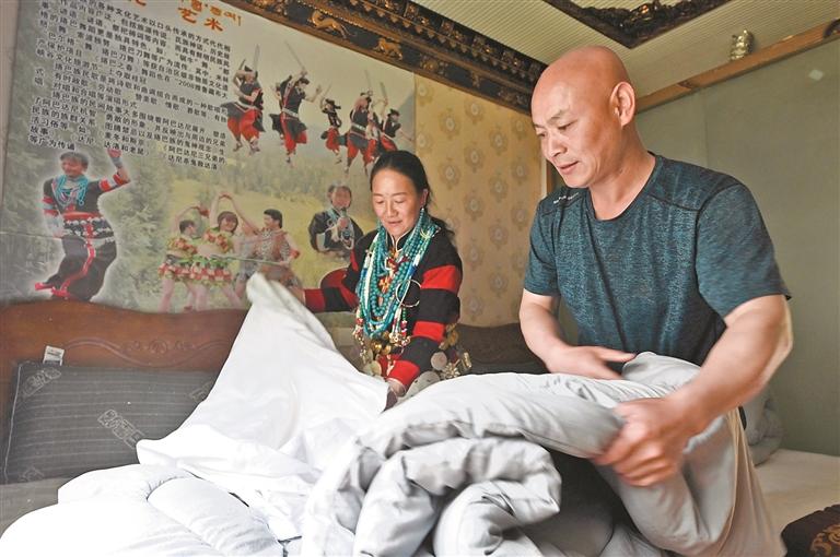 米林市南伊珞巴民族鄉(xiāng),亞達兒與丈夫鄭定全在整理民宿房間。記者 白瑪澤旺 攝