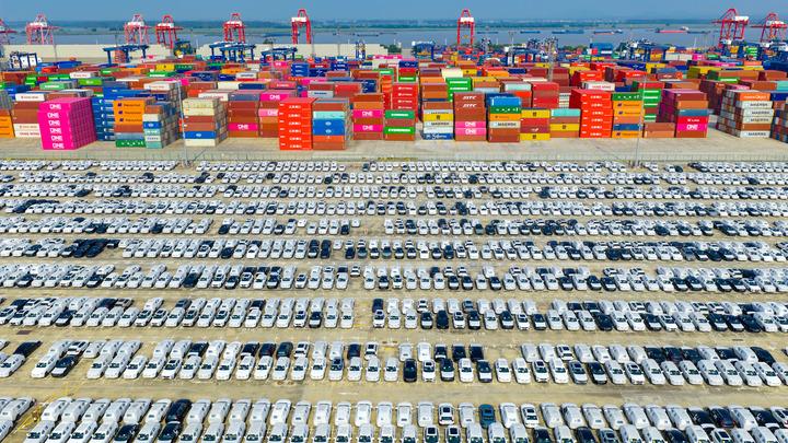 2025年10月4日在江蘇省港口集團(tuán)南京港龍?zhí)陡蹍^(qū)拍攝的準(zhǔn)備裝船出口的汽車(無人機(jī)照片)。新華社發(fā)(楊素平攝)