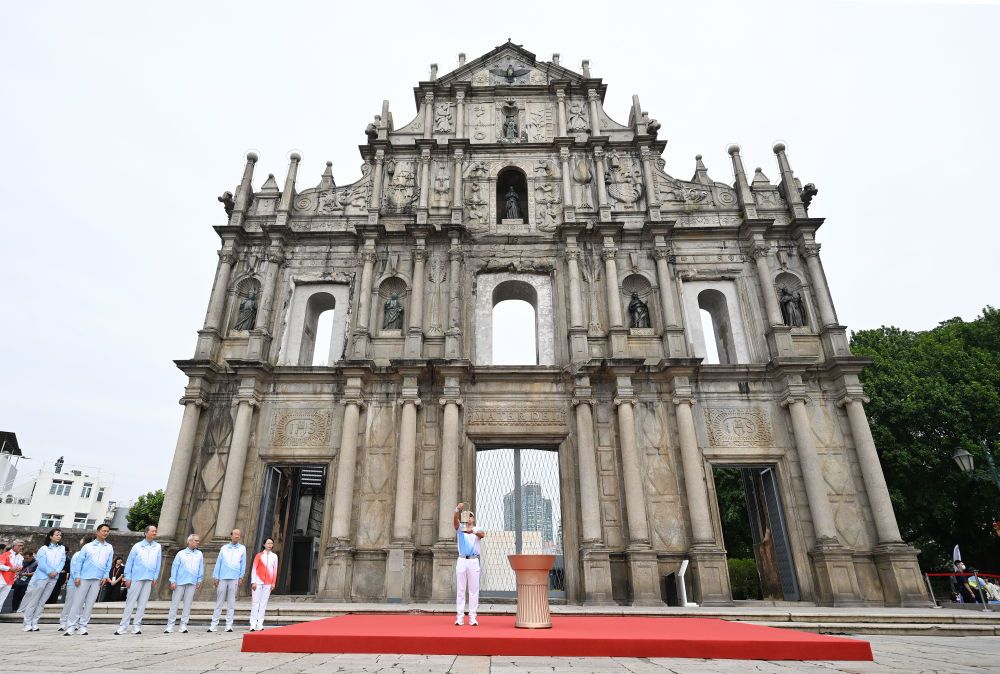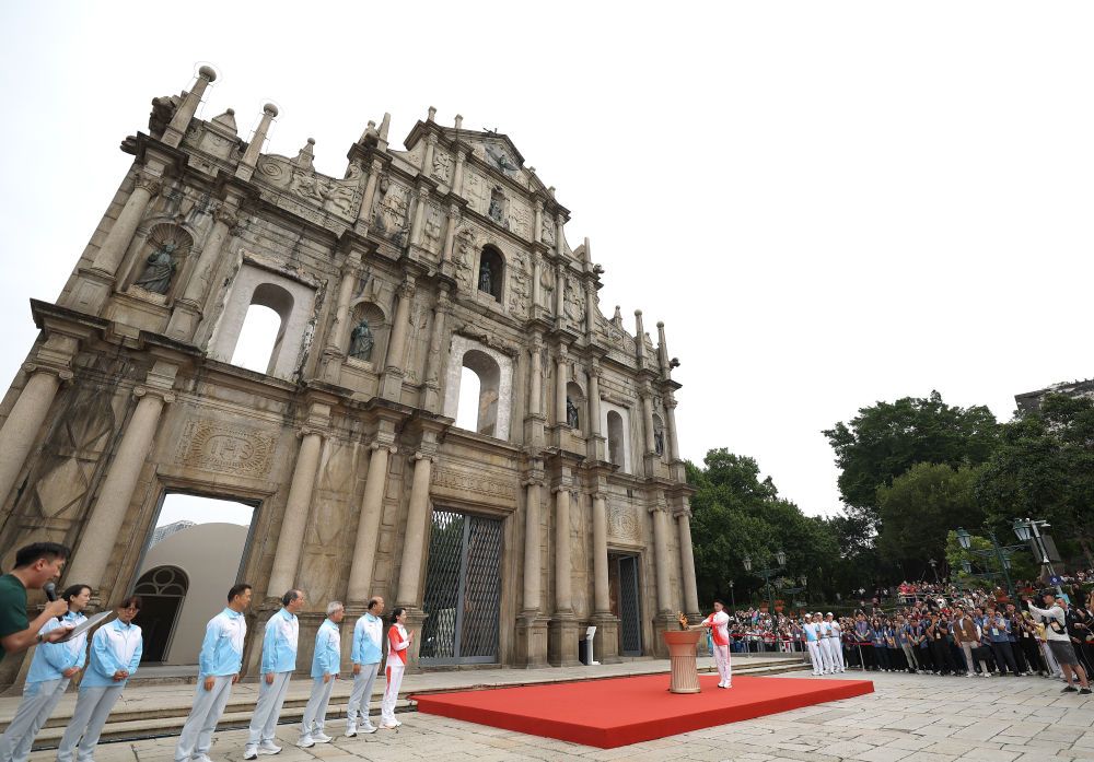 ↑ 火炬手郭建恒(中)在大三巴牌坊前點(diǎn)燃圣火盆。新華社記者 胡星宇 攝