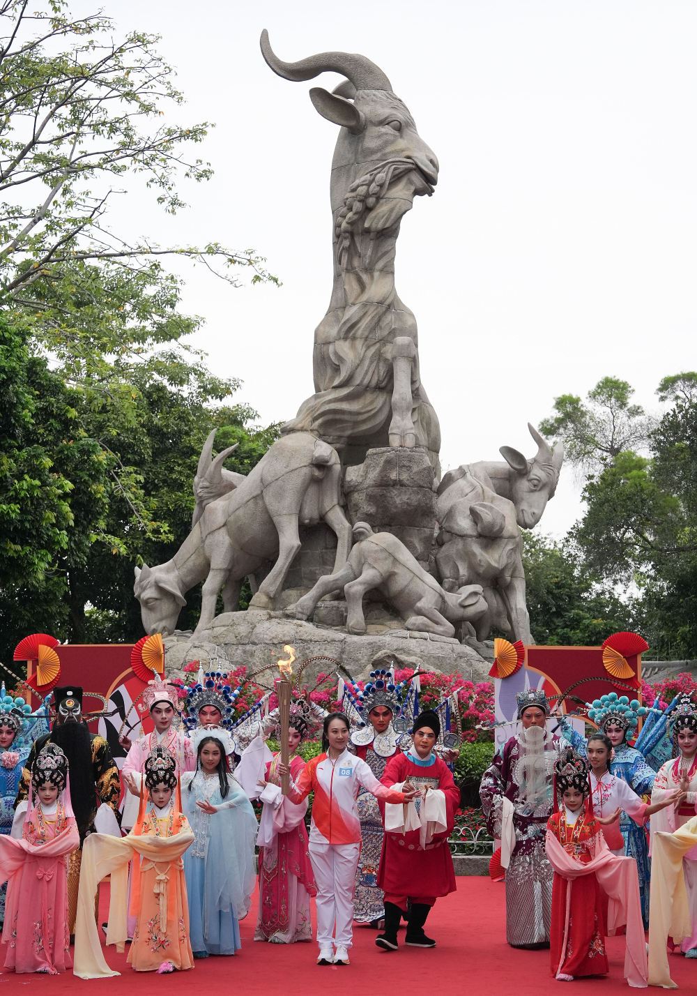 ↑ 火炬手李嘉宜(中)在廣州越秀公園內(nèi)的五羊雕像前傳遞火炬。新華社記者 杜宇 攝