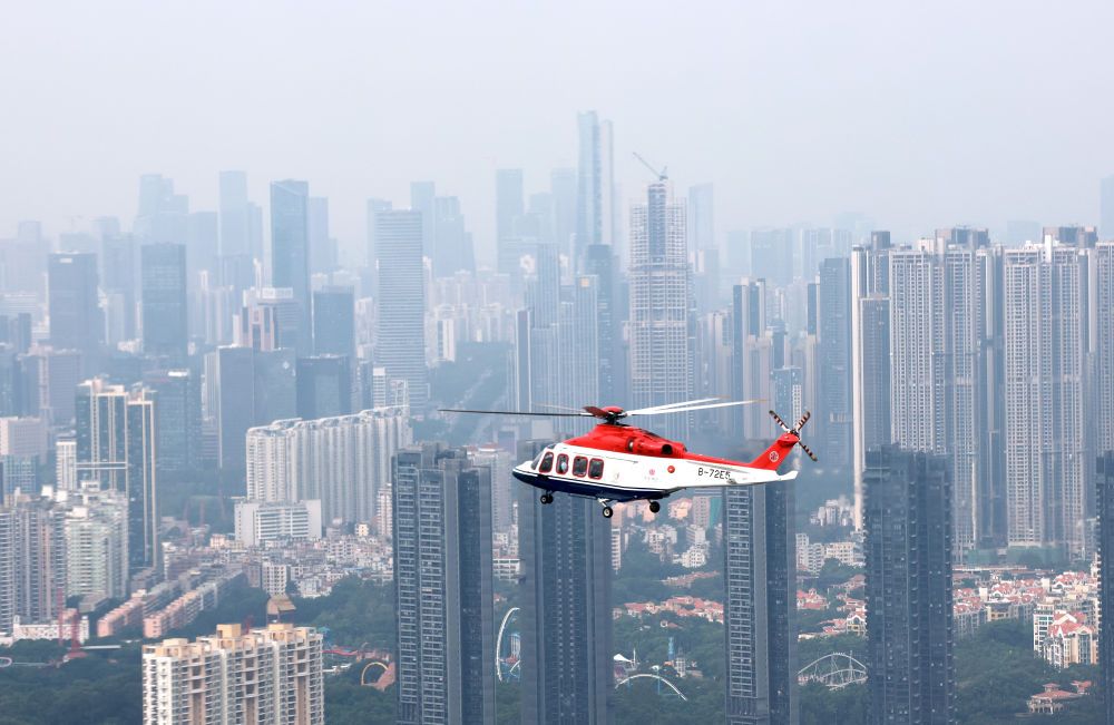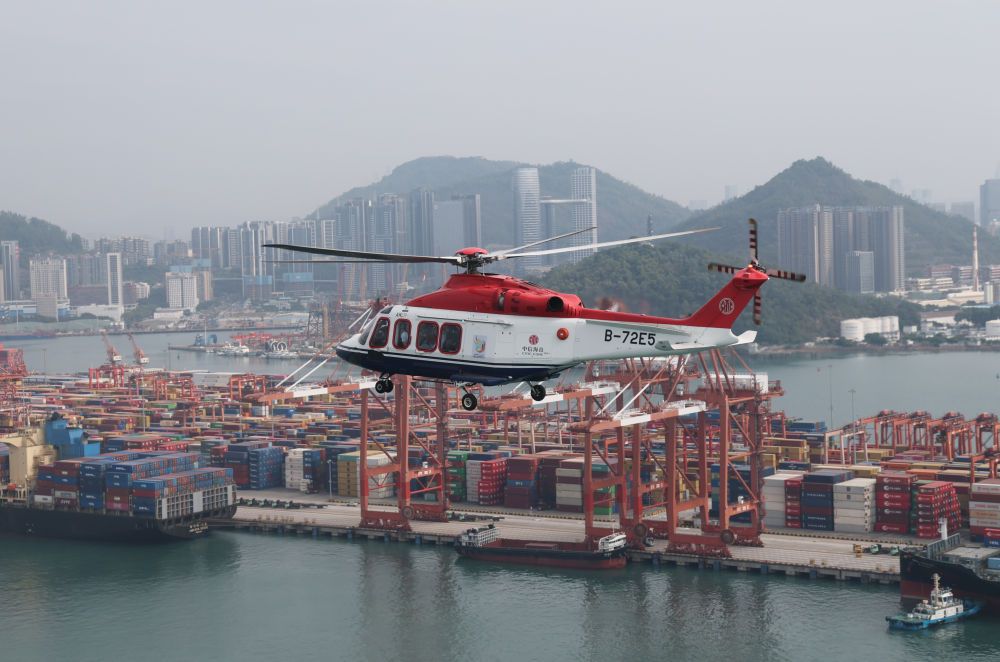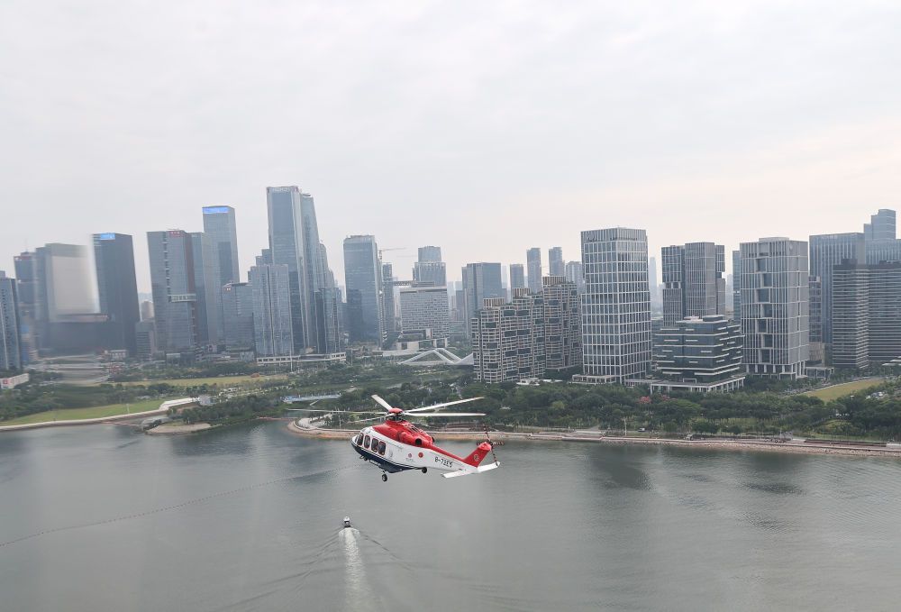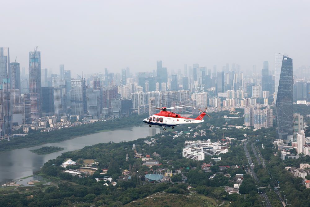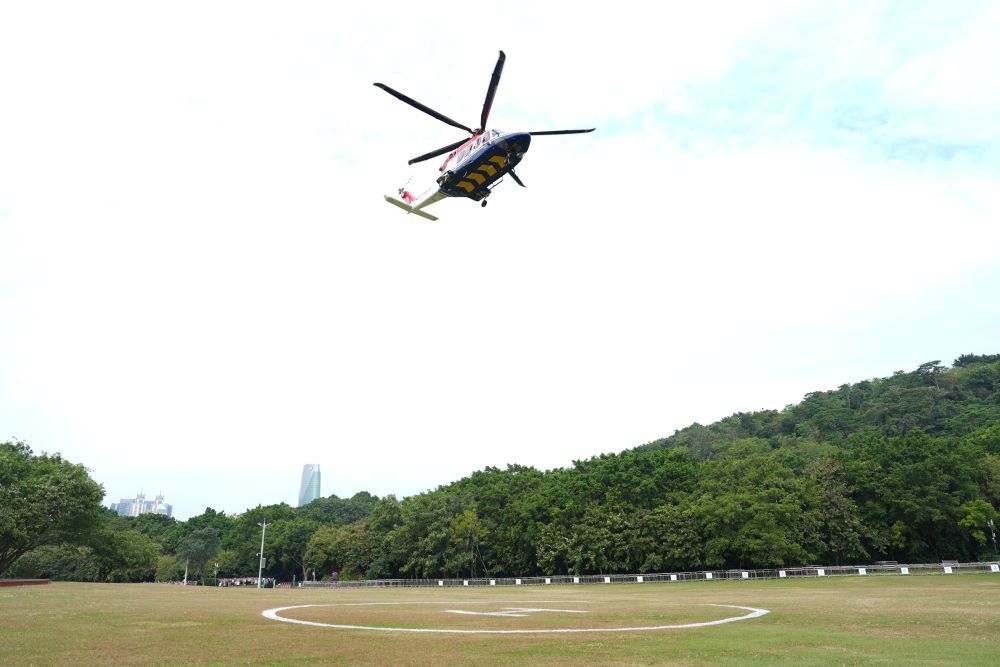 ↑ 搭載圣火的直升機(jī)進(jìn)行空中傳遞。新華社記者 江漢 攝