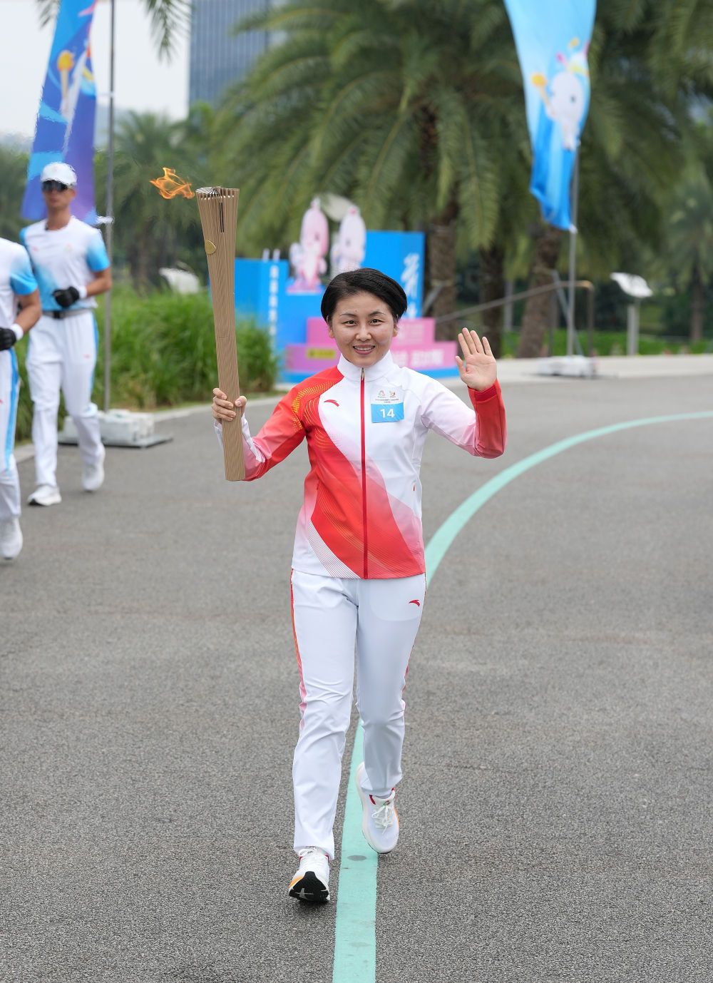 ↑ 火炬手何超瓊在火炬?zhèn)鬟f活動(dòng)中。新華社記者 那宇奇 攝