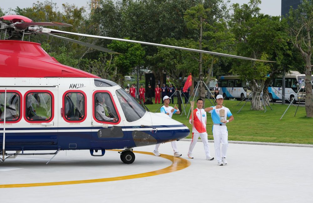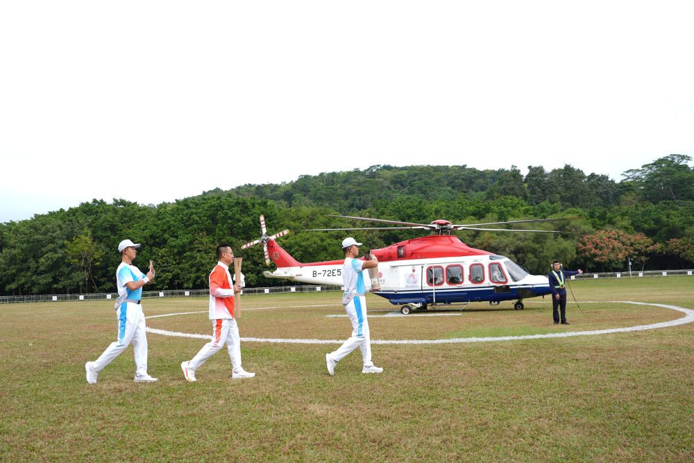 ↑ 火炬手蘭小軍(左二)手持火炬向直升機(jī)走去,他將進(jìn)行空中傳遞。新華社記者 江漢 攝