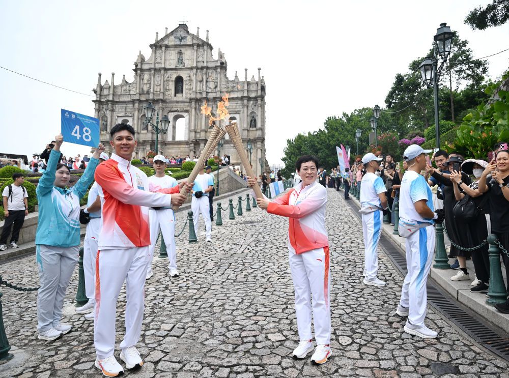 ↑ 火炬手郭建恒(右)、區(qū)海欣在大三巴牌坊前傳遞火炬。新華社發(fā)(張金加攝)