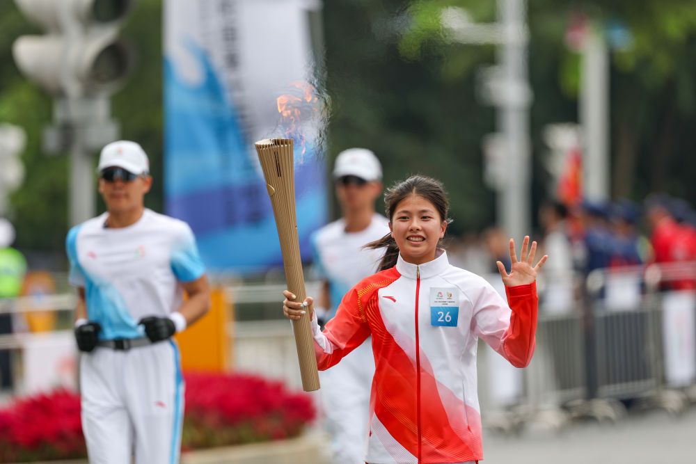 ↑ 火炬手葉欣怡在火炬?zhèn)鬟f活動(dòng)中。新華社記者 黃偉 攝