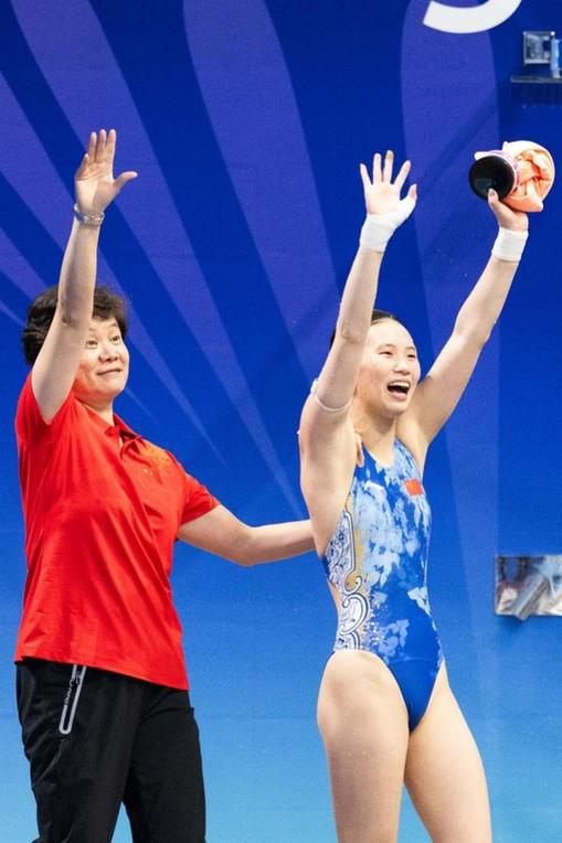 獲得冠軍的上海隊選手陳芋汐(右)和教練在賽后慶祝。(圖片來源:十五運(yùn)會信息服務(wù)中心)