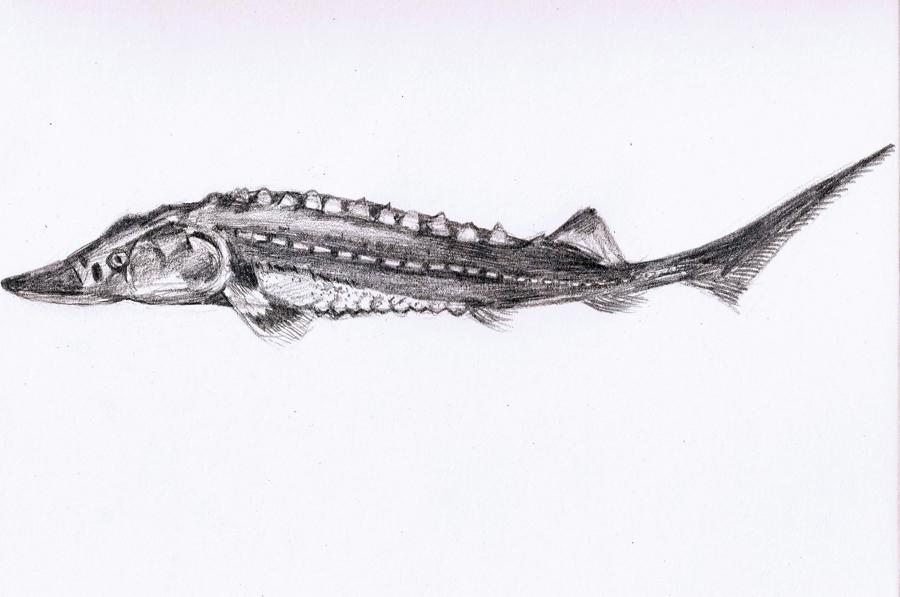 中華鱘生長(zhǎng)較快,體型碩大,最大個(gè)體體長(zhǎng)可達(dá)4米,體重可達(dá)680千克,最長(zhǎng)壽命可達(dá)40齡以上 上海海洋大學(xué)學(xué)生手繪