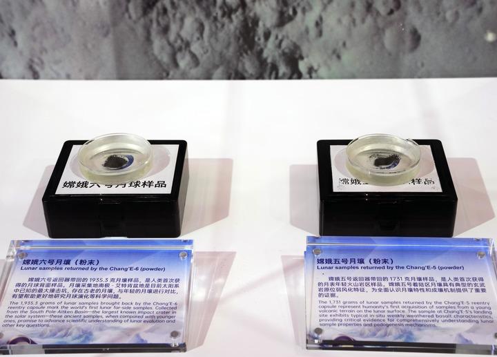 2025年11月5日在第八屆進博會國家展中國館拍攝的“嫦娥五號”月壤和“嫦娥六號”月壤。新華社記者 劉穎 攝