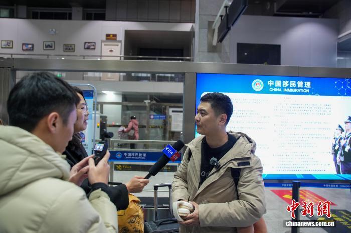 圖為中國旅客朱良東從友誼關(guān)口岸入境后接受中新網(wǎng)記者采訪。陳冠言 攝