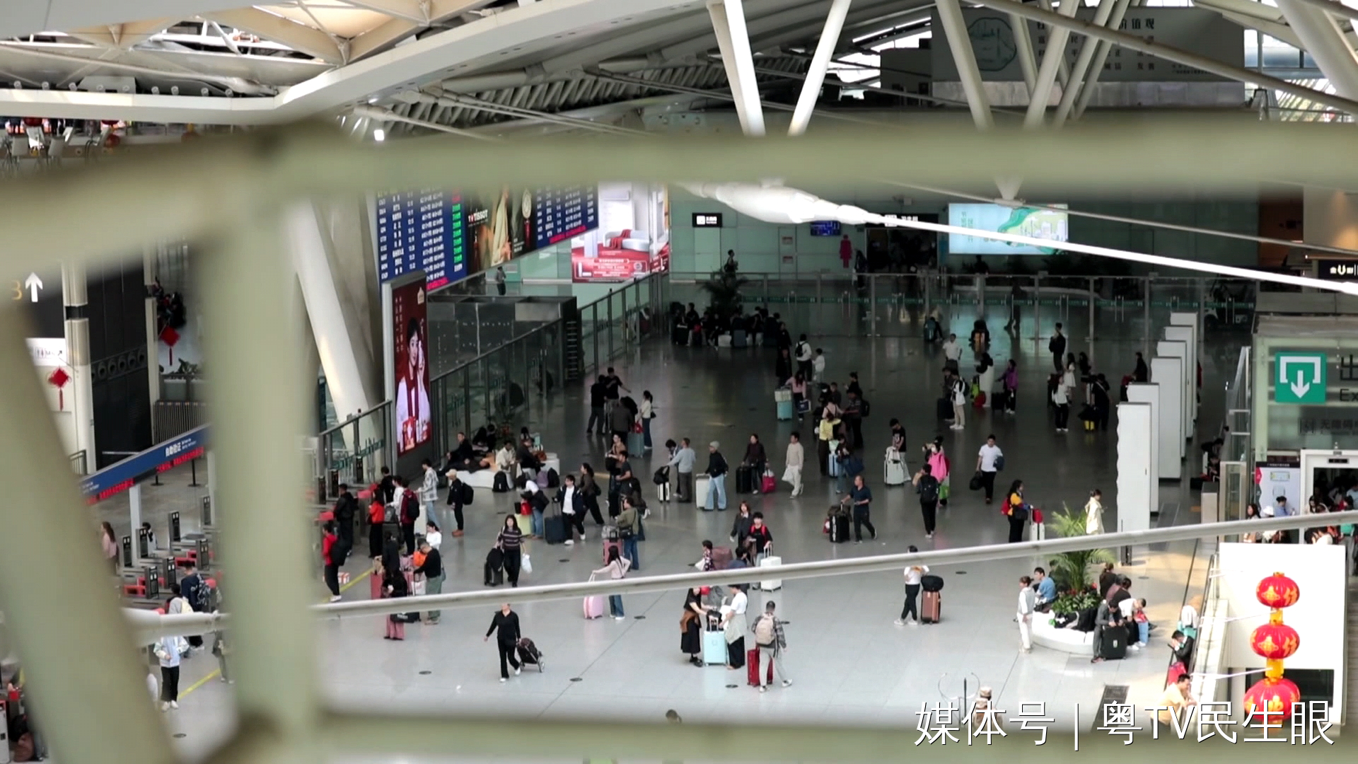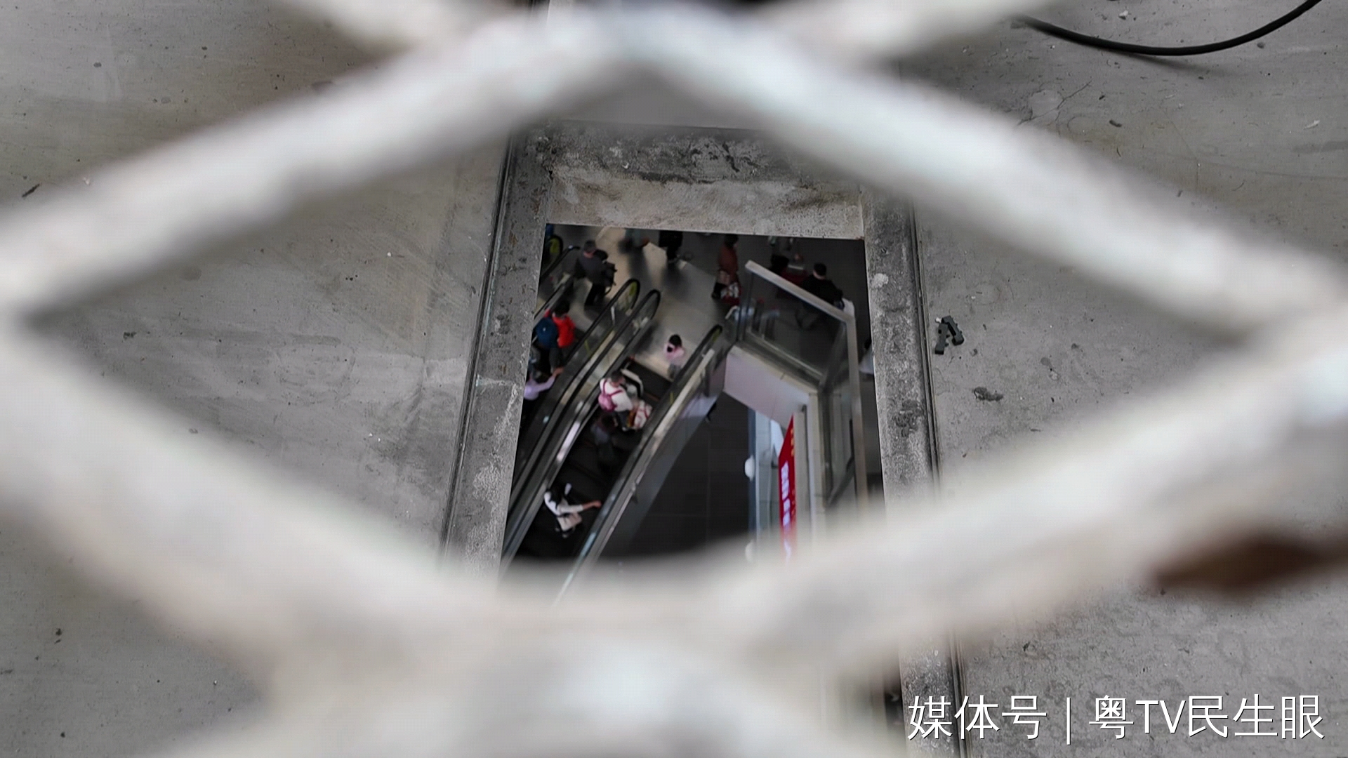 這是從鐵絲網(wǎng)孔洞中往下看的視角,往下數(shù)兩層樓,是廣州南站正在運轉(zhuǎn)的進(jìn)站扶梯。