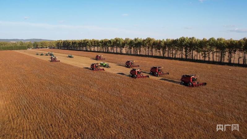 在鶴崗市蘿北縣,大馬力機(jī)車正在收獲大豆(央廣網(wǎng)發(fā) 李晟 攝)