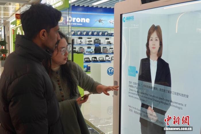 2月28日,浙江義烏,中外客商在店鋪門(mén)前與多語(yǔ)種數(shù)字人對(duì)話。董易鑫 攝