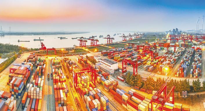 夜幕下的武漢陽邏港集裝箱碼頭,貨物裝卸繁忙有序。(湖北日報全媒記者 薛婷 攝)