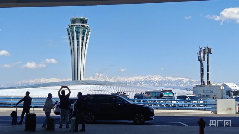 旅客在烏魯木齊天山國際機(jī)場航站樓前拍照留念 (央廣網(wǎng)記者郭璁悅攝)
