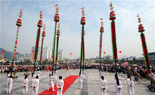 建甌挑幡 魏永青攝 建甌挑幡始于明末,建寧府(今建甌)大洲造船的工匠應(yīng)征入伍民族英雄鄭成功收復(fù)臺(tái)灣的隊(duì)伍。在收復(fù)臺(tái)灣后的農(nóng)歷正月二十四,百姓為迎接凱旋的將士,設(shè)宴席唱戲,將士們則將帶回的軍旗捆在長(zhǎng)竹竿頭,盡情揮舞,對(duì)壯烈捐軀的弟兄們寄以深深的懷念。以后每年均以此禮節(jié)告慰英烈,逐漸演化成當(dāng)今建甌民間特有的挑幡習(xí)俗,世代相傳。 建甌挑幡制作工藝上有獨(dú)特的風(fēng)格。就形制而言,建甌挑幡的幡要求選用約十米長(zhǎng)的筆直毛竹,削去枝葉,上朱紅油漆,畫(huà)上各種吉祥圖案。竿頂扎著彩燈,彩燈之下是一座用竹骨和彩綢制成的六角寶塔,四周綴掛著數(shù)只小銅鈴,塔底順桿懸掛錦幡一幅,幡幅上繡有褒頌詞句。據(jù)鑒定,最長(zhǎng)的幡為10.2米,幡重為20.6公斤。 今天的建甌挑幡在保留傳統(tǒng)技法的基礎(chǔ)上不斷發(fā)揚(yáng)光大,形成了一套異彩紛呈、新穎高難的新套路,如“手舞東風(fēng)轉(zhuǎn),肩扛南天松,肘擎中軍令,牙咬北海塔,口挑百戰(zhàn)旗,鼻托乾坤棒,腳踢西方柱”等。 具有文化娛樂(lè)與強(qiáng)身健體雙重功能的建甌挑幡名揚(yáng)海內(nèi)外,中國(guó)上海大世界吉尼斯總部將其列入“吉尼斯大全”。2005年,建甌挑幡入選福建省第一批非物質(zhì)文化遺產(chǎn)代表作名錄;2008年,入選第一批國(guó)家級(jí)非物質(zhì)文化遺產(chǎn)擴(kuò)展項(xiàng)目名錄。 |