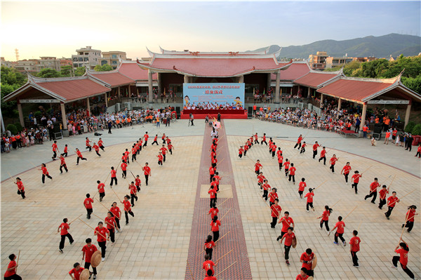 廈門(mén)翔安區(qū)武術(shù)、宋江陣暑期公益培訓(xùn)班。李毓琳 攝 宋江陣,源于明代正德年間抗倭斗爭(zhēng)中的軍旅步戰(zhàn)武術(shù)陣法和鄉(xiāng)團(tuán)訓(xùn)練,明末清初鄭成功將宋江陣帶到臺(tái)灣,將此軍事訓(xùn)練方法普及推廣,冠以流傳民間的《水滸傳》英雄故事與演武內(nèi)容,并不斷吸收民俗信仰祀典廟會(huì)等其他演藝成分,逐漸演化成為深受閩臺(tái)人民喜愛(ài)的一種演藝陣頭。 2009年,在廈金宋江陣被列入福建省第二批省級(jí)非物質(zhì)文化遺產(chǎn)名錄的兩年后,林良菽扛起宋江陣復(fù)興大旗,他攜手臺(tái)灣臺(tái)東大學(xué)吳騰達(dá)教授推動(dòng)兩岸宋江陣文化傳承。從“閩臺(tái)宋江陣文化節(jié)”,到兩岸首個(gè)“宋江陣民俗文化廣場(chǎng)”、“閩臺(tái)宋江陣博物館”,演繹出“四月高雄內(nèi)門(mén)觀宋江,十月翔安內(nèi)厝看宋江”的兩岸佳話,讓沉寂多年的宋江陣成為閩臺(tái)之間基層文化交流最重要的紐帶之一。 2020年林良菽、吳騰達(dá)雙雙獲得“廈金宋江陣”廈門(mén)市級(jí)非遺傳承人的稱(chēng)號(hào)。 |