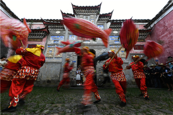 五夫龍魚戲表演 五夫鎮(zhèn)文化站供圖 “龍魚戲”是流傳于武夷山市五夫鎮(zhèn)的一種傳統(tǒng)民間文化表演活動,原為蓮魚戲,始于五代,興于兩宋,是鄉(xiāng)人迎春納福,祈求風(fēng)調(diào)雨順、國泰民安的民俗活動,后因朱熹喜登進(jìn)士,又添入"鯉魚跳龍門"的內(nèi)容,鼓勵(lì)后生向朱熹學(xué)習(xí),至今已有上千年歷史。 五夫龍魚戲的表演簡明易懂,舞姿設(shè)計(jì)古樸而原始,帶有明顯的古閩越族文化元素的特征,是中國勞動人民智慧的結(jié)晶,加上其道具制作精美、彩繪大膽,使得它在千百年的傳承中散發(fā)出獨(dú)特的人文魅力,成為閩北地區(qū)眾多民間文化表演中的一朵奇葩。 但由于歷史原因,五夫龍魚戲這一民俗傳統(tǒng)曾一度銷聲匿跡。21世紀(jì)初,在武夷山市委、市政府對民間藝術(shù)的高度重視下,五夫文化站對這一民俗進(jìn)行重新挖掘整理,2011年被列入福建省級非物質(zhì)文化遺產(chǎn)名錄(傳統(tǒng)舞蹈類)。 |