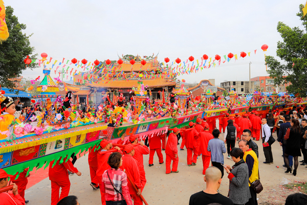 多節(jié)閣棚連成“蜈蚣身”,配以龍頭龍尾,上坐裝扮戲曲人物之兒童,由小伙子抬著巡游進(jìn)香,祈求辟邪除災(zāi)、迎祥納福。