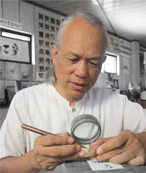 陳逢顯在雕刻。(資料圖片) 首屆中華文化與兩岸文創(chuàng)產(chǎn)業(yè)融合發(fā)展論壇日前在福州舉行。臺灣微雕藝術家陳逢顯攜欖核雕、米粒雕、金屬雕等微雕精品亮相同期舉辦的文創(chuàng)產(chǎn)品精品展,其中,世界上最小的“黃金小老鼠”系列作品尤為驚艷。只見6只黃金小老鼠齊聚在直徑3毫米的金元寶上,表情各異,栩栩如生。陳逢顯介紹說,這些純金雕刻的小老鼠尺寸僅1毫米左右,有“十全十美”“同心協(xié)力”等造型,“雕了6個月,失敗了上百次”。 毫厘之技 上世紀60年代初,陳逢顯與微雕結(jié)緣。當時還是小學三年級的他第一次參觀臺北故宮博物院,見到了清代雕刻家陳祖章的傳世之作——雕橄欖核舟。3.4厘米長的核舟桅帆繩索俱全,門窗開合自如。舟上,雕著8個神態(tài)動作各異的人物,有人手持書卷,有人正在船頭煮茶……舟底還有毫芒細刻《后赤壁賦》全文三百余字。方寸之間,就把蘇東坡游赤壁的景象描摹得活靈活現(xiàn),讓人驚嘆不已。自幼愛好藝術的陳逢顯便許下心愿,要學習微雕這門中華傳統(tǒng)藝術。 知道陳逢顯的理想后,小學老師鼓勵他先練好書法,“老師說要把中華傳統(tǒng)文化發(fā)揚光大,得從基本功學起”。從此,篆書、隸書、行書……各種書法字體陳逢顯無不潛心臨摹鉆研,他還廣泛涉獵繪畫、雕塑等,為日后的藝術創(chuàng)作打下了堅實基礎。 1981年,陳逢顯進入臺灣印鈔廠,得以接觸到放大鏡、鋼針、微毛筆等基礎工具。每天手持鋼針雕刻貨幣雕版,日積月累,他便磨煉出精細的雕刻技巧和沉靜平和的耐心。 由于當時臺灣幾乎無人從事微雕事業(yè),無師可拜的陳逢顯只能自行揣摩,這條路走得格外孤獨而艱辛。除了苦練手藝,他還到臺灣各大圖書館搜集文獻,了解微雕工法。 微雕最早見于中國的甲骨文,因為甲骨取得不易,因此不少甲骨文字都寫得很小,到了宋末才由畫工加以制作推廣,現(xiàn)在臺北故宮博物院中典藏的多寶格、象牙雕等也是微雕工藝頗具代表性的作品。臺北故宮博物院收藏有多枚欖核舟,方寸之間,可見中華傳統(tǒng)文化之博大。 十年一劍