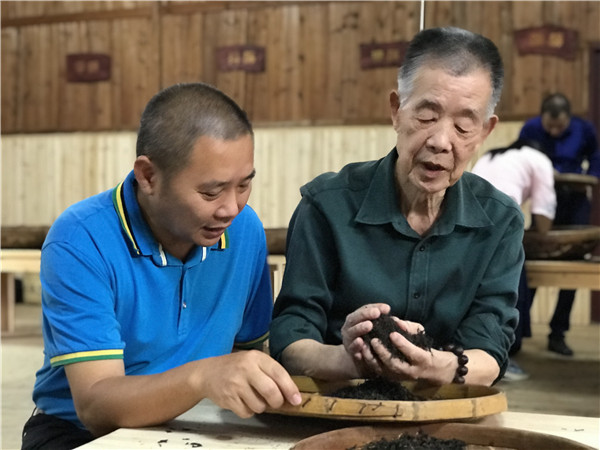 李宗雄(右)在與茶人交流制茶經(jīng)驗(yàn)。80歲的李宗雄老先生是“唐利號(hào)”茶莊李鋼的后人,坦洋工夫茶制作技藝福安市級(jí)非遺代表性傳承人之一。福安茶業(yè)協(xié)會(huì)供圖 李宗雄,18歲到福安茶廠坦洋初制廠學(xué)做茶,至今從事制茶六十多年,在李宗雄記憶中,紅茶制作工藝沒有教科書式教學(xué),也沒有什么資料,老一輩茶人制茶做茶主要是通過老師傅言傳身教出來的。 “早期制茶揉捻等工序都用人工,也有用腳踩,費(fèi)力又不衛(wèi)生,現(xiàn)在雖改機(jī)械揉捻,但依舊需要制茶師掌握時(shí)間,萎凋、發(fā)酵、烘焙靠人工操作,這些都很考驗(yàn)制茶師的水平……”李宗雄說。 “我堅(jiān)持做茶六十多年,雖已80歲,但一走到生產(chǎn)車間,聞到茶香氣味,人就特別精神,總感覺精力充沛。”李宗雄說。迄今為止,他仍然習(xí)慣在茶葉生產(chǎn)加工期間,到車間親眼看看茶葉生產(chǎn)發(fā)酵情況。 李宗雄說,年輕時(shí),他在福安茶廠坦洋初制廠做茶,最長(zhǎng)曾經(jīng)兩天兩夜沒睡覺?!疤貏e是春茶開始時(shí),我們國營(yíng)茶廠從茶農(nóng)那里收茶青,我們一兩都不能少給茶農(nóng),一片葉子也不舍得扔掉。茶青多的時(shí)候,一下子幾百擔(dān)進(jìn)來,我們一天加班加點(diǎn)做完,第二天又有茶青進(jìn)來,也要趕著及時(shí)做完?!?/p> “我從小耳濡目染身邊很多茶人、前輩制茶做茶的習(xí)慣,其間交了很多朋友,有制茶的、有賣茶的、有喝茶的,也有寫茶文章的新老朋友?!崩钭谛壅f,天下茶人是一家,也因?yàn)檫@一生與茶葉結(jié)下不解之緣,他從茶葉中汲取了很多道不出的營(yíng)養(yǎng)。 通過和茶的接觸,李宗雄感到一片茶葉有它的一片天地?!疤寡蟠迥艹蔀橐粋€(gè)歷史文化名村,是坦洋工夫茶的傳統(tǒng)手工藝和獨(dú)特的文化魅力把這個(gè)村,從經(jīng)濟(jì)、從文化、從建筑方面做了提升。現(xiàn)在坦洋村給我們留下的古民居、炮樓等等,都是時(shí)代的珍貴遺產(chǎn)?!?/p> 一步一腳印 做茶先做人