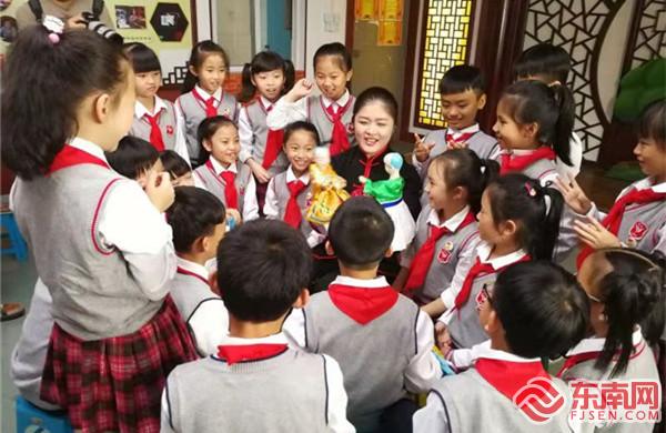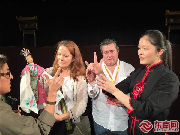 蔡美娜向外國友人傳授晉江掌中木偶技藝。受訪者供圖 為了讓更多人了解晉江掌中木偶戲,蔡美娜與劇團同事克服種種困難,堅守在表演領(lǐng)域傳播這項藝術(shù)文化。2016年,第五屆上海國際木偶藝術(shù)節(jié)上,蔡美娜表演完畢回到后臺,一名外國嘉賓便找到了她,跟她學(xué)了幾個掌中木偶的表演動作,“雖然我們語言不通,但是藝術(shù)是沒有界限的。”這次經(jīng)歷給蔡美娜留下了深刻印象,她意識到將這項藝術(shù)繼續(xù)傳承并發(fā)揚創(chuàng)新的重要性。“‘木偶人才培養(yǎng)計劃’在2012年被聯(lián)合國教科文組織列入人類非物質(zhì)文化遺產(chǎn)優(yōu)秀實踐名冊,作為南派布袋戲省級代表性傳承人,對發(fā)揚傳承這項藝術(shù),我也有義不容辭的責(zé)任。”