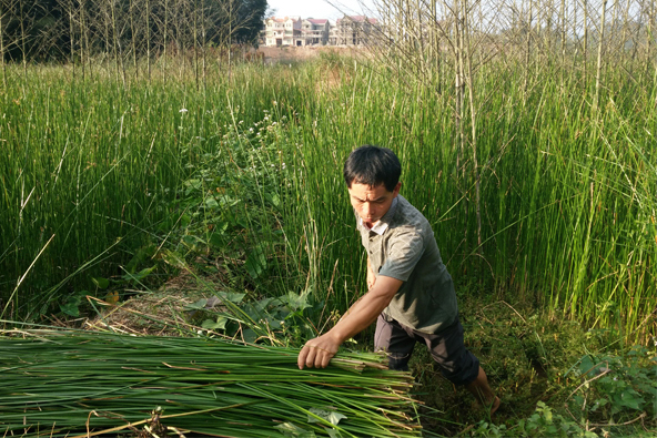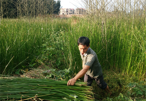 鄧麗娣的愛(ài)人檢查織好的貢席質(zhì)量。 陳莉莉 攝 看著已經(jīng)織好的貢席,記者一眼就能看出貢席的鎖邊工藝區(qū)別于一般的草席,特殊的原草手工鎖邊方式保證了席子不易松散,牢牢地咬住了每一根席草。從外觀上來(lái)看,貢席采用的是特殊的原料莞蒲草都對(duì)半剖開(kāi)后,再由手工編織更細(xì)密結(jié)實(shí),而普通席草沒(méi)有剖開(kāi),機(jī)械直接編織導(dǎo)致成品稀疏。此外,鄧麗娣拿出柜子的一團(tuán)線球,她告訴記者,她織的貢席里面都是用四根纖維麻繩作為牽引,使得席子結(jié)實(shí)不易變形,同時(shí)也讓席子變得厚實(shí),可普通的草席僅僅是用單根化纖線做牽引線而已。 “目前市面上買的草席基本都是機(jī)器編制的,漂亮是漂亮,但做工再好,也難以達(dá)到‘站立不倒,滴水不漏’的說(shuō)法……”據(jù)當(dāng)?shù)卮迕窠榻B,這個(gè)草席更神奇的是有很多保健功效,睡在草席上不患風(fēng)濕,當(dāng)嚴(yán)冬臘月睡草席,可以不用床墊,赤膊睡在上,很快就能暖和起來(lái),如在炎熱的夏天,睡在上面有一股清涼的氣味撲鼻而來(lái)。 據(jù)了解,編織貢川草席的席草——莞蒲草,對(duì)土壤的要求特別高,需種植在特有的沼澤山壟田里,田里常年要有山泉水流動(dòng),保證土壤的濕度,長(zhǎng)出的莞蒲草纖維長(zhǎng),柔韌性強(qiáng),不易斷裂。 技藝相傳 巧手編織幸福生活