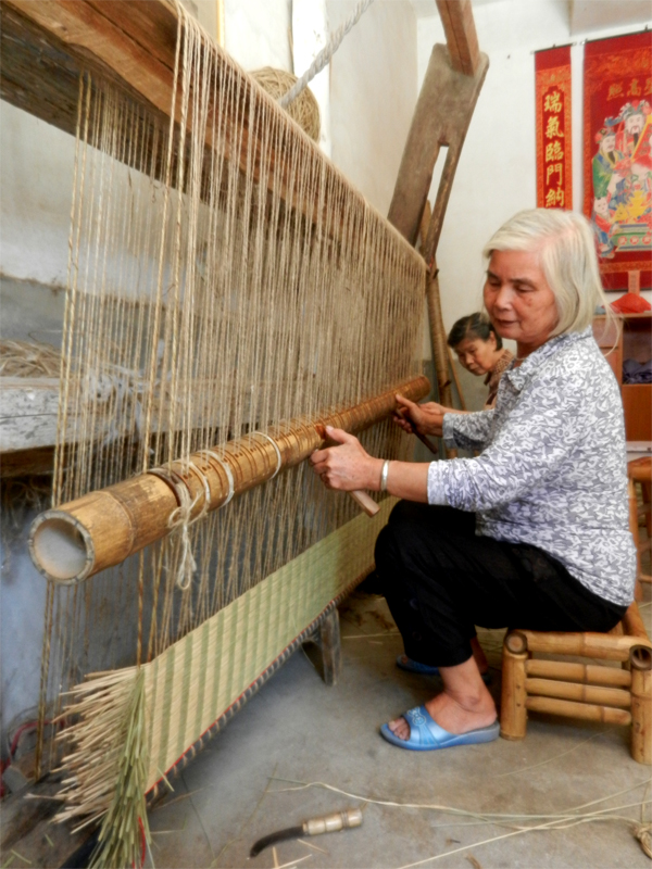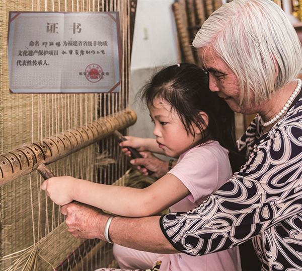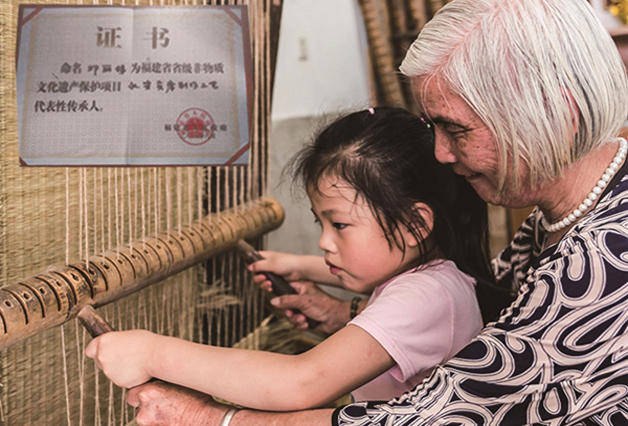 鄧麗娣與兒媳搭配編織貢席。 受訪者供圖 小時(shí)候,家里人工力量不夠,鄧麗娣慢慢地開(kāi)始與奶奶搭檔,學(xué)習(xí)如何打制貢席。18歲那年,鄧麗娣嫁了人,她便與丈夫搭檔打制貢席;兒子娶媳婦后,又和兒媳一起做。這一做,就是一輩子。直到現(xiàn)在,鄧麗娣還常在編席機(jī)前和兒媳配合打制席子。 回憶起和婆婆一起打制草席的時(shí)光,兒媳楊秀春說(shuō):“打制草席就是一樁辛苦活!我們一起走過(guò)了多少個(gè)日日夜夜。記得那時(shí)是好幾個(gè)幼兒園同時(shí)找上門來(lái)向我們定制給學(xué)生的貢席,大大小小算起來(lái)有600余床!那段時(shí)間算是全家總動(dòng)員啦!“說(shuō)完便哈哈大笑起來(lái)。 楊秀春告訴記者,因?yàn)樨曄|(zhì)量?jī)?yōu)、具有極高的使用價(jià)值,很多人買過(guò)后都會(huì)繼續(xù)介紹客人來(lái)定制。訂單暴增的那段時(shí)間,凌晨?jī)扇c(diǎn),空中還掛著半輪彎月,婆婆就把自己?jiǎn)拘炎鱿R惶焓畮讉€(gè)鐘頭,幾乎沒(méi)有停歇,到晚上十點(diǎn)多好不容易織好兩條席,還得準(zhǔn)備第二天做席的材料。分捆、篩選、分級(jí)……必須把所有材料準(zhǔn)備好后,她們才能安心入睡。也正是這些席子,把一家人緊緊地“捆綁”在一起,日子過(guò)得充實(shí)又幸福。 政府搭臺(tái) 非遺之花重?zé)ㄉ鷻C(jī)