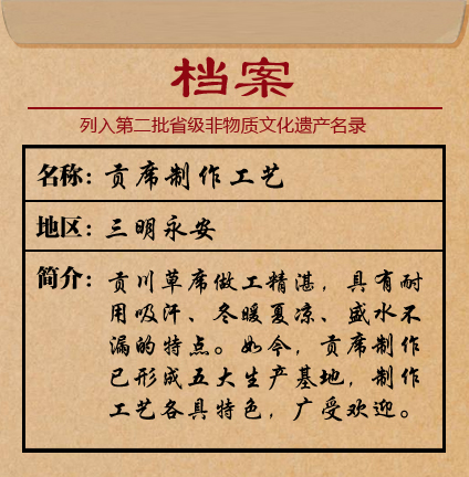 貢川草席聞名遐邇,制作工藝歷史悠久。早在宋代,貢川草席就作為貢品進(jìn)獻(xiàn)皇宮,貢席的稱號(hào)由此傳開(kāi)。明代中期,貢席更是暢銷八閩、廣受歡迎。