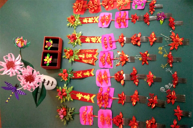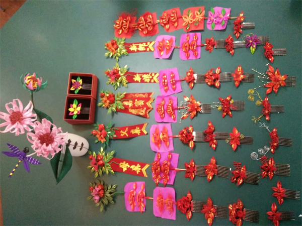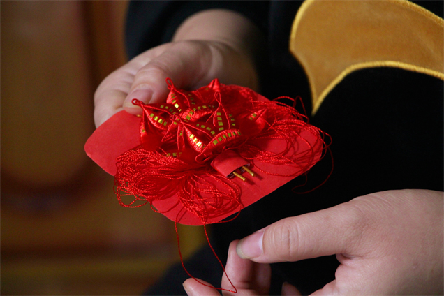 用于結婚的春仔花。 受訪者供圖 或許是手指纏繞鐵絲、絲線的手法變化神奇,或許是春仔花習俗給人以欣欣向榮的意味,洪厝的姑娘們做春仔花的手藝就這樣傳了出去。有嫁出去的女兒,就有春仔花的“開枝散葉”;嫁到村里的媳婦,在耳濡目染下,也開始喜歡這紅彤彤的“傳家寶”,學成后教給娘家的姐妹們。 經(jīng)過幾百年的傳承和發(fā)展,春仔花如今形成了婆婆花、新娘花、普通花、孩童花以及喪事花等十來個品種,每種花擁有不同的含義,在不同的場合供大家使用。 結婚,是春仔花“出席”最多的場合。新娘的媽媽精心選擇十二對(閏年十三對)春仔花,讓新娘帶到婆家。這其中就有婆婆花、新娘花、姑娘花、妯娌花等,每一對花的元素都有講究。