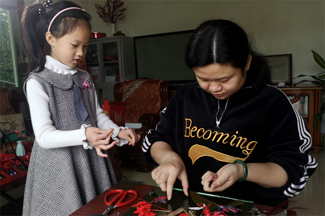 洪曉瑜8歲的女兒學習春仔花。 東南網(wǎng)記者 鄒玒攝 洪曉瑜和洪厝大多數(shù)姑娘們一樣,很小的時候就開始接觸春仔花了。7歲時,她便和外婆一起學做春仔花,8歲就賺到自己的“第一桶金”,一共2元錢。 春仔花在洪厝是一種融入生活的習俗。閩南人一生中三件大事—結婚、生子、起大厝(蓋房)都離不開它,白事也常用它做答謝親友的贈禮,因此先前,村民們會在農閑時制作春仔花貼補家用。 如今,在茶余飯后,親友們圍桌“話仙”,即使斟滿了茶,手里依然忙著扎花,既是閑情,也是樂趣。洪曉瑜的母親洪素珍前幾年因眼疾漸漸看不清東西,手卻依然能熟稔地折出花來,絲線纏繞,簡單樣式的花不到一分鐘就在她手中誕生了。 洪厝的不少人家有一張桌子,放著紅線、染成紅色或金色的卡紙以及鐵絲,簡簡單單的工作臺,就能源源不斷地產(chǎn)出春仔花。如今,洪素珍一天要在桌前坐上十個鐘頭,她眼睛不好,但技藝在,做一些簡單式樣的春仔花,五百對一箱地裝好,有客戶需要就可以隨時取用。洪曉瑜則更多編一些花樣繁復的春仔花,編起來更為辛苦,但這已成為多年的習慣了,她笑稱“算是一種胎教”。 洪曉瑜的微信名字叫“守藝人”,她希望將春仔花代代相傳,結出碩果。如今,她8歲的女兒也在學習春仔花,她和其他傳承人更是將春仔花帶到了校園?!斑@是屬于閩南文化的獨特記憶,開課的時候,我們第一堂課往往不教上手操作,而是讓孩子們了解這項習俗?!焙闀澡ふf,她們在翔安中心小學、洪厝小學都開設了興趣課程,每周一節(jié)。此外,她們還與當?shù)氐纳鐓^(qū)開辦春仔花培訓班,不定期走進廈門大學、集美美術學院等各大高校,讓更多的人了解、體驗春仔花。 一段緣 帶動春仔花花開兩岸