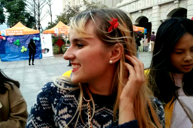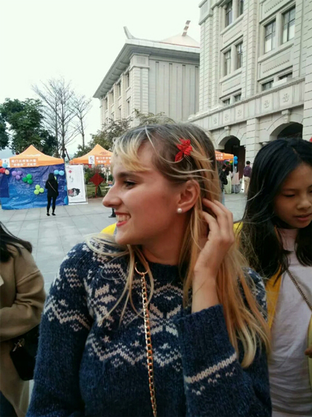 廈門大學的交流活動中,外國友人佩戴春仔花。 受訪者供圖 在村子里,評比誰家的花做得好,就像一場人們口中的“選秀”。不僅每家每戶的巧婦人會溝通交流,更有不少人慕名而來。自從春仔花習俗獲評首批廈門市非物質文化遺產(chǎn)后,前來取經(jīng)的人越來越多。 “有不少是訂貨的,他們到村口一問,想要什么花式的、什么價位的,村民們心里都有數(shù),就會推薦到相應的人家?!焙闀澡ふf,如今,也有不少手工愛好者前來,在這里待上一段時間,專門學習這門手藝,這其中也不乏來自臺灣的手藝人。 臺灣的春仔花是明朝后期閩南移民帶去的,在洪曉瑜看來,這是兩岸一衣帶水的緣分。一開始,臺灣當?shù)氐牧曀撞]有洪厝這么講究,春仔花的花式花樣也不如洪厝齊全?!扒皫啄暧胁簧倥_灣的手藝人來參觀,我們也很開心有這樣的機會和他們交流。”洪曉瑜說,因地域不同,春仔花在不同地區(qū)發(fā)展出了屬于自己的藝術特色,“臺灣有的地方一開始是用皺紋紙來做,也有的地方花比較小,臺灣手藝人來洪厝參觀學習后,我們給他們寄去一整套的春仔花及材料,我們這的寓意也慢慢融入他們的春仔花里”。2018年,臺灣纏花(春仔花)藝師陳惠美及其助理陳秀敏前來參加海峽兩岸民間藝術節(jié)之“傳統(tǒng)工藝DIY”活動,洪曉瑜同其他傳承人一道,進行了現(xiàn)場交流和溝通。